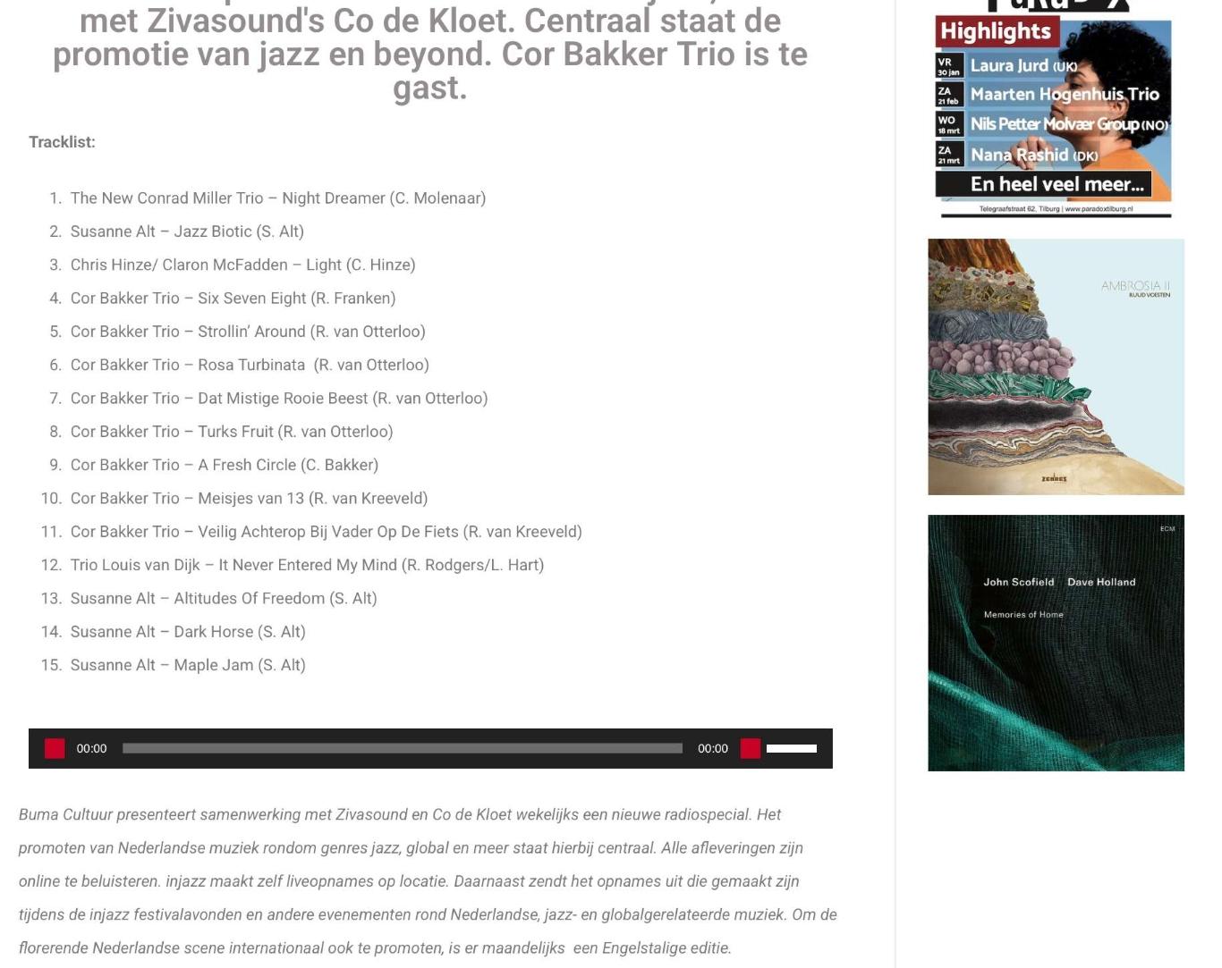 In the numerous podcasts "injazz with Co de Kloet," listeners will hear music by emerging and established jazz talent, recordings made at festivals large and small, newly released (jazz) CDs, and original productions with (inter)national soloists and orchestras.
