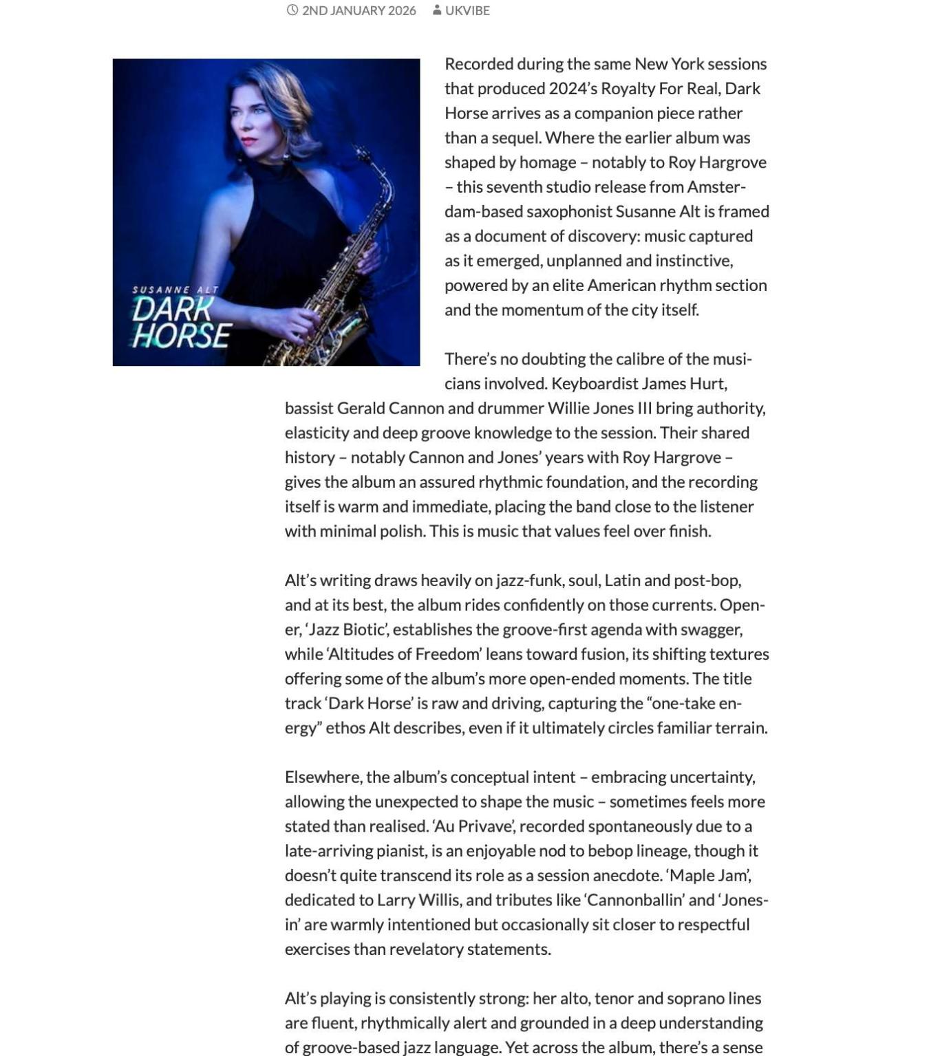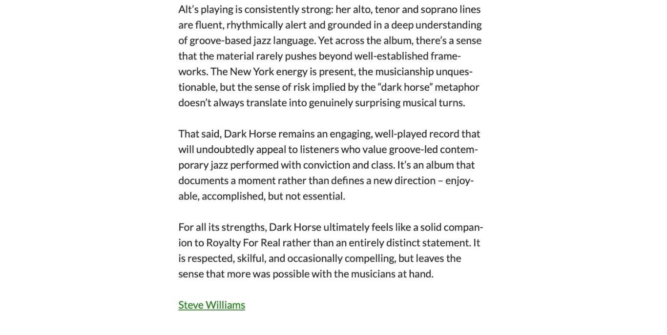 The album includes “Jazz Biotic,” “Dark Horse”, and the tribute-inspired “Maple Jam.” The title Dark Horse reflects the spirit of revealing unexpected potential and breaking new ground—marking this as a highly anticipated work in Alt’s evolving career.