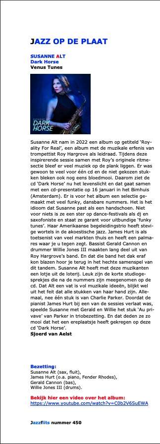 A selection has been made for the album with many funky, danceable tracks. It's the idiom that fits Susanne like a glove. It's not without reason that she is a star at dance festivals as a DJ and saxophonist, guaranteeing exuberant "funky" tunes. Her American backing trio has strong roots in acoustic jazz. James Hurt is a versatile keyboardist and has an impressive track record. Bassist Gerald Cannon and drummer Willie Jones III were long members of Roy Hargrove's band. And you can hear that band's ability to blow the roof off in the tight interplay of this tandem. Susanne Alt has a winning combination with these musicians. The short studio conversations that follow the songs on the CD are enjoyable. Alt's wealth of musical ideas is evident from the fact that all the pieces are hers. All, no, one, is by Charlie Parker. Because pianist James Hurt was late for one of the sessions, Susanne played Parker's piece "Au privave" with Gerald and Willie as a trio. And they performed so beautifully that it earned a place of honor on this CD, "Dark Horse."